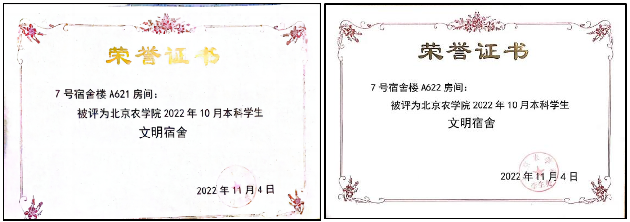 班级同学遵守校规校纪,具有良好的道德品质。在宿舍建设方面,成绩显著,班内无脏、乱、差宿舍,宿舍成绩优秀率达到了百分之百,累计获得7次文明宿舍。其中,7A622宿舍曾4次被评为william威廉英国本科学生文明宿舍。
