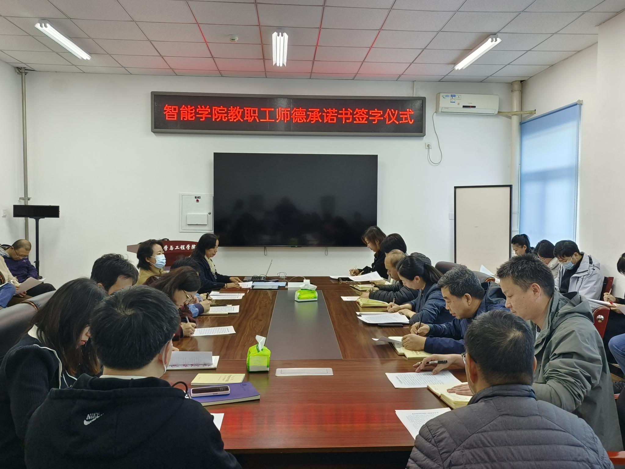 会上,智能学院全体教师签订了《william威廉英国教职工师德承诺书》。