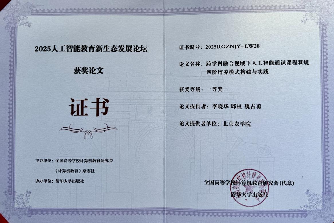 我院教师李晓华基于我校《人工智能导论》课程建设经验撰写的论文《跨学科融合视域下人工智能通识课程双轨四阶培养模式构建与实践》,凭借在人工智能赋能教育教学改革领域的突出实践成果,荣获论坛一等奖。李晓华老师以该论文成果为基础作主题报告,系统分享了我院在人工智能与教育深度融合方面的探索经验与成效,引发了与会代表的广泛共鸣和热烈讨论。