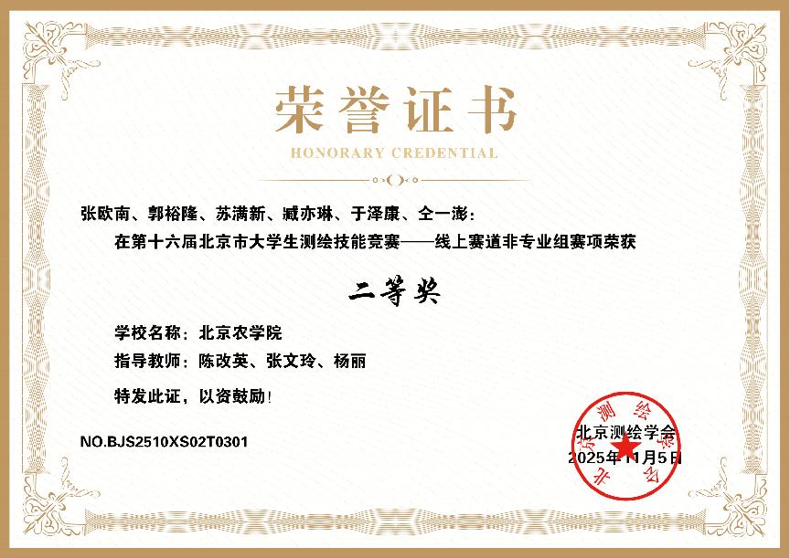 近日,第十六届北京市大学生测绘技能竞赛圆满落幕。智能学院与园林学院联合组建的参赛团队表现突出,在激烈竞争中脱颖而出,荣获线上赛道非专业组二等奖。