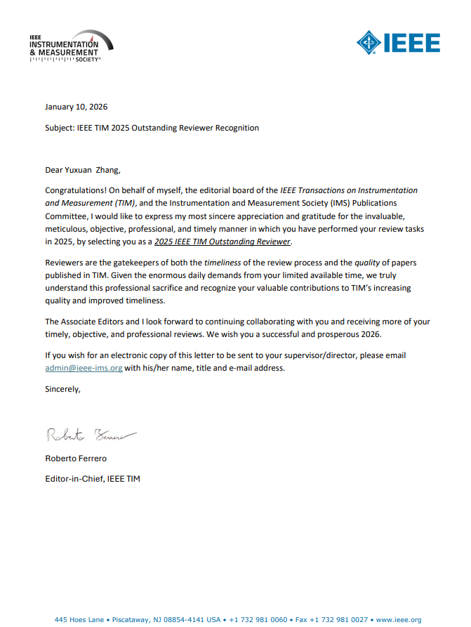 近日,《IEEE Transactions on Instrumentation and Measurement》(IEEE TIM)期刊授予Williamhill中文物联网系张宇轩老师“2025年度杰出审稿人奖(Outstanding Reviewersof 2025)”,以表彰其高质量、建设性和及时的审稿工作。该奖项是TIM期刊编辑团队综合审稿人对期刊投稿文章提出及时细致的专业评判与修改建议,为了鼓励审稿人为维持高水平期刊所做的贡献而颁布。其他获奖者分别来自香港城市大学、英国曼彻斯特大学、天津大学、北京航空航天大学和清华大学等院校。特此向张宇轩老师表示祝贺!