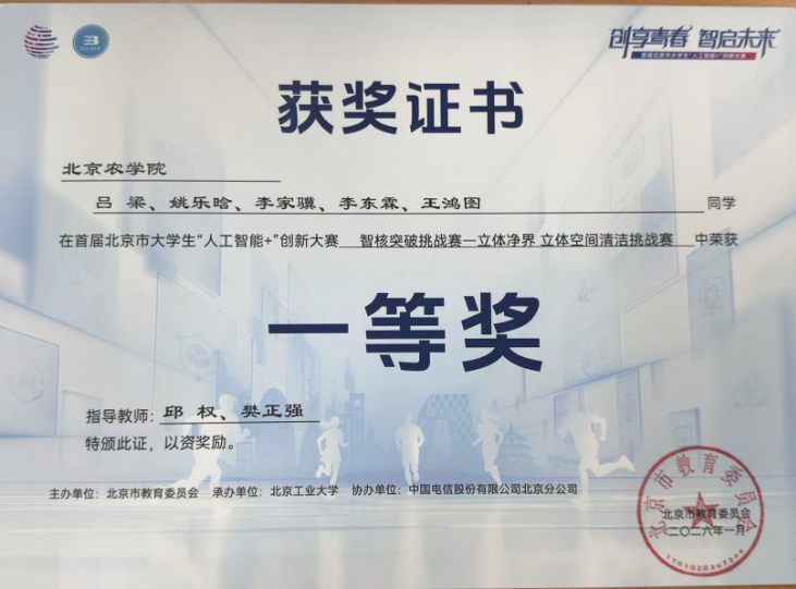 2025年12月27日,首届北京市大学生“人工智能+”创新大赛在北方工业大学举行。近日获奖证书正式下发,我院“正无穷战队”在智核突破挑战赛赛题四“立体净界——立体空间清洁挑战”中荣获一等奖。