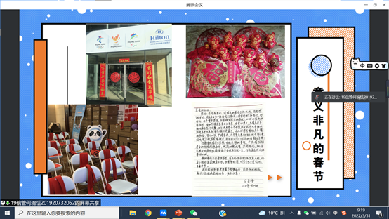 为进一步做好冬奥志愿服务工作的成果转化,讲好“冬奥故事”、传播“冬奥精神”,将参与冬奥盛会所激发的精气神和正能量释放出来、发扬出去,计信学院2019级信管2团支部举办线上主题团日活动,让更多同学了解冬奥的志愿服务,将志愿精神发扬出去。党总支书记韩宝平,学院团委书记宁宁,班主任廉世彬参加活动。