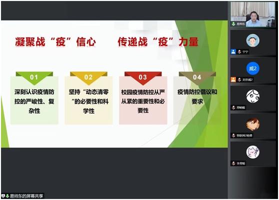 易帅东指出“青年大学生是祖国的未来、民族的希望、家庭的牵挂。具有流动规模大、聚集密度高、传播范围广的群体性特点”,这就要求高校必须毫不动摇的坚持“动态清零”政策。他通过列举高校大学生在疫情防控中警示案例,号召大家严格遵守学校疫情防控要求,做到不动摇,不躺平,坚持“动态清零”方针成为行动指南和思想自觉;不抱怨,不敷衍,及时准确上报个人有关情况和每天坚持健康打卡;不懈怠,不侥幸,防范意识和安全意识常存于心,注意饮食卫生;不添堵,勤疏导,服从疫情防控,以阳光心态和正能量去影响感染他人;不信谣,善辨别,倾听官方和权威宣传解释,不传播小道消息;不掉队,常锻炼,保持良好生活习惯,居家认真学习,加强锻炼,提高免疫力。