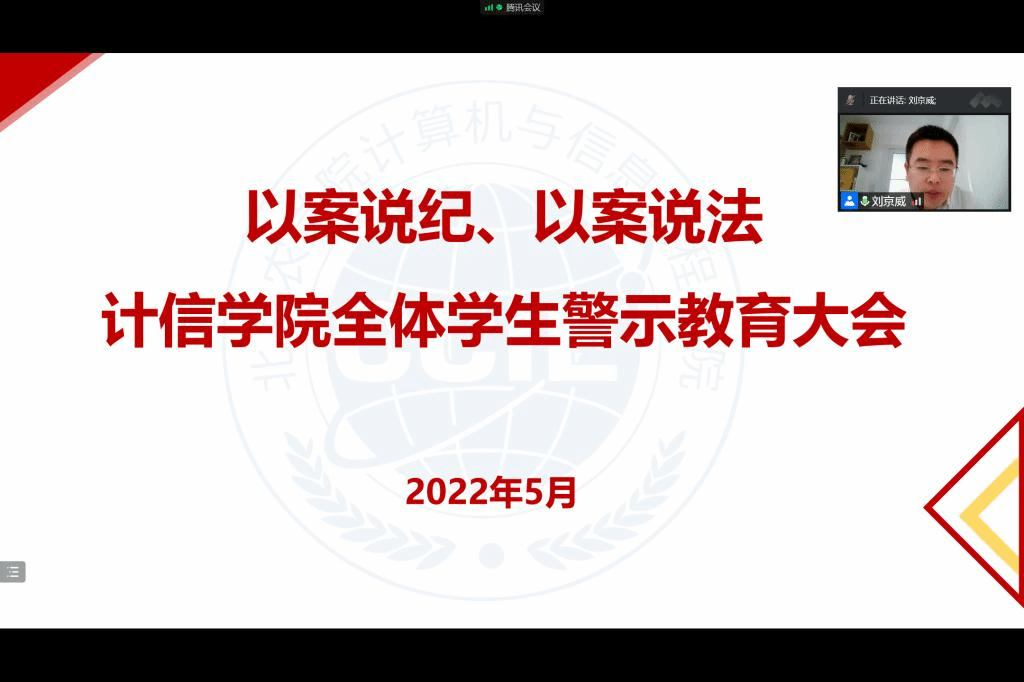 党总支副书记、副院长刘京威向全体同学开展了“以案说纪、以案说法”为主题的警示教育。他从学校和学院近年来学生在日常行为、消防安全、疫情防控、诚信征信、网络舆情和电信诈骗等方面的违法违纪真实案例讲起,向同学们强调了违法违纪的严重后果。他要求全体同学务必引起高度重视,自觉遵守法律法规、校纪校规,进一步规范个人行为,以案为鉴、以案为戒,争做新时代模范青年。