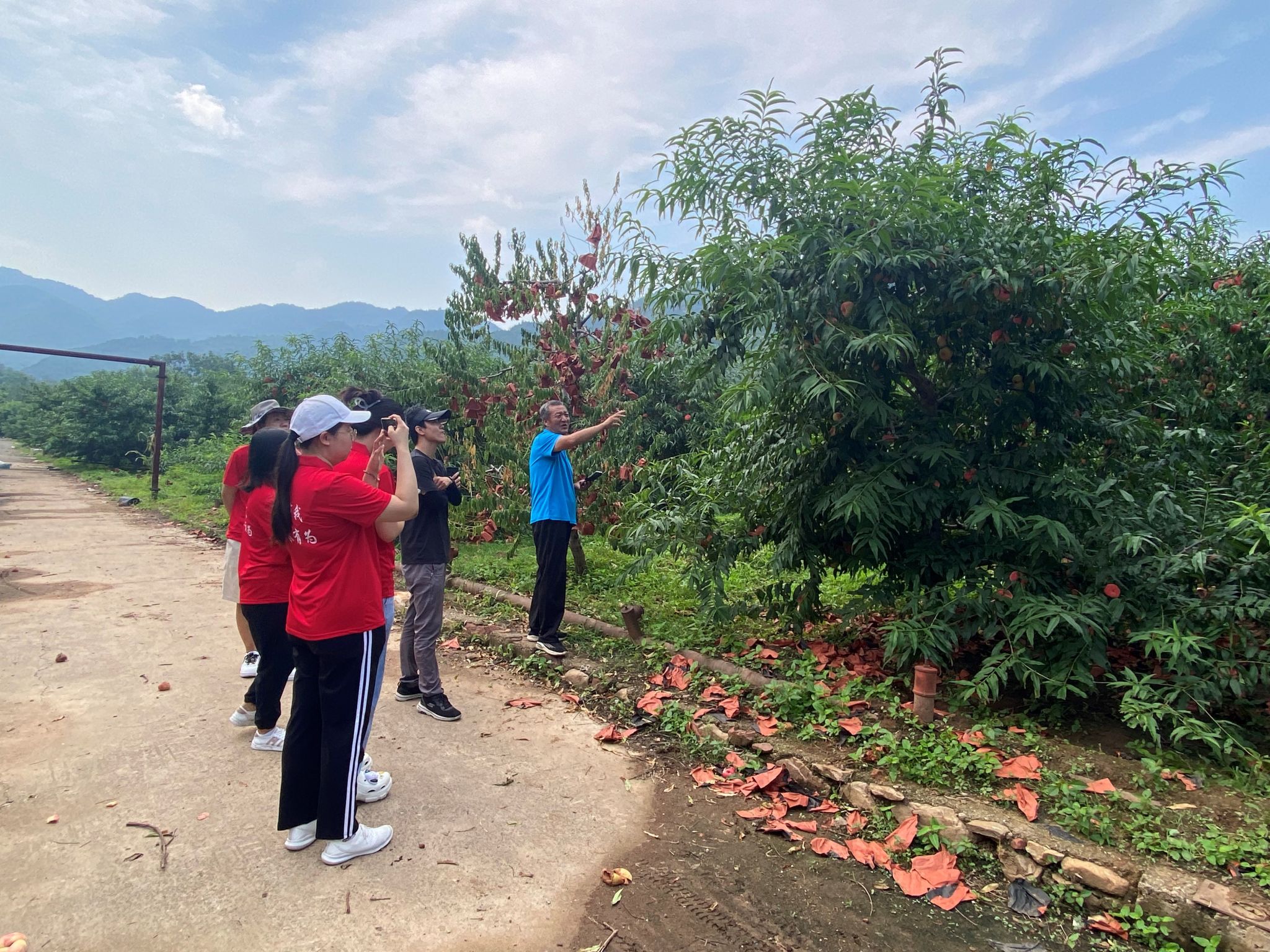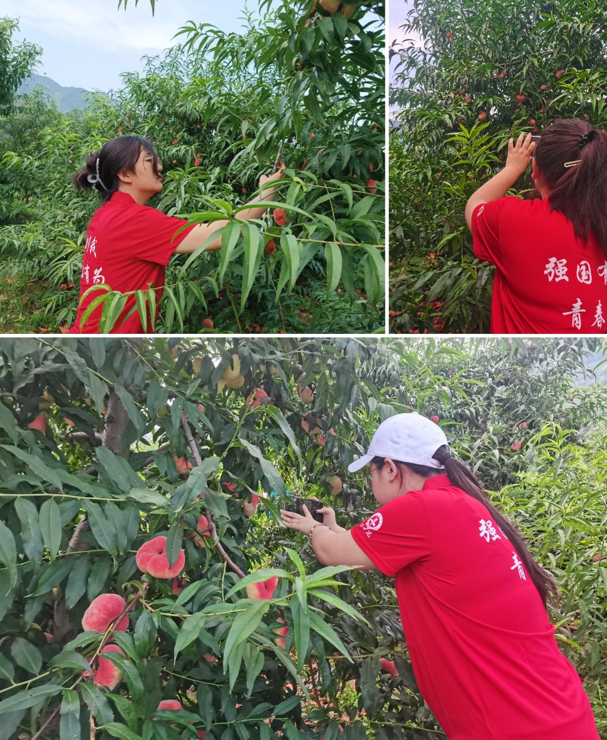 随后,杨主任带我们对大桃种植基地进行了实地参观,实践团的成员也在杨主任的指导下,分类的开展大桃图片的采集工作,本次主要采集的种类包换:瑞蟠29、瑞光39、黄油桃、白油桃等,同时还针对一种大桃的大小、成熟度等进行分类整理。