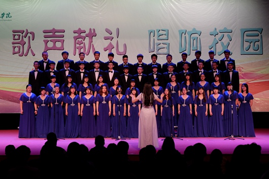 比赛中,我院学生合唱团第七个出场,女生袭一身蓝色高雅长裙,男生着一身庄重的黑西装,首先在服装设计安排上得到了评委的好评,吸引了观众的眼球。同学们首先演唱的是自选歌曲《飞向原野》,声部均衡清晰,配合默契,声音婉转动听,获得台下观众的阵阵掌声。紧接着演唱的是指定曲目——校歌《绿色的希望》,同学们用激情昂扬的歌声唱出了对母校的热爱以及积极奋进的斗志。在演唱过程中,观众掌声不断,评委们也频频点头表示肯定。最终,我院以9.68分的优异成绩摘得桂冠,留下了光辉的一刻。