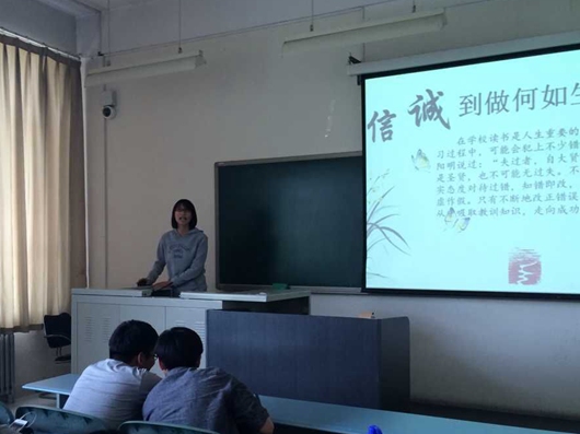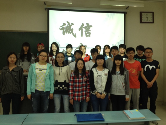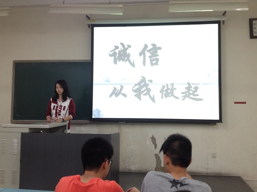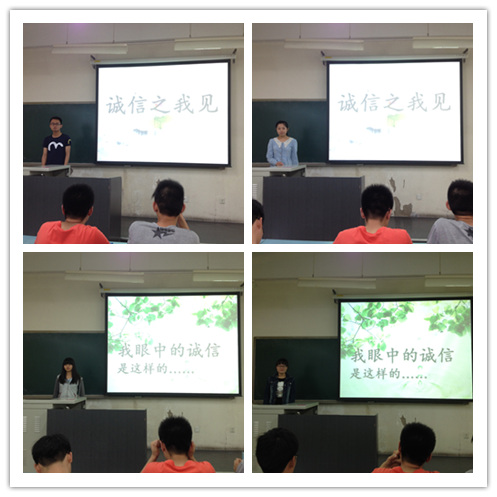 各班通过召开以诚信为主题的班会,引起大家对诚信的认识,使同学明确“诚信”的含义,理解“诚信”对学生自身发展的重要意义。各班分别通过精美的PPT、优美的文字、丰富的图片加上讲演者精彩的演讲,向大家展示了诚信的重要性,引起同学们的共鸣。同学们纷纷表示,要从自我做起,从小事做起,做一个有诚信,讲信用的人,同时要号召身边的人加入到这个队伍中来。部分班级还举办了诚信教育主题演讲活动,通过学生的演讲,不仅让同学们看到了诚信的重要性,也看到了当今社会讲诚信与不讲诚信的种种现象。诚信是大学生长期热议的话题,理想是每个人一生中追求的目标。主题演讲活动不仅可以提高同学们的语言表达能力和勇气,而且也让更多的同学对诚信有了更加深入的认识。