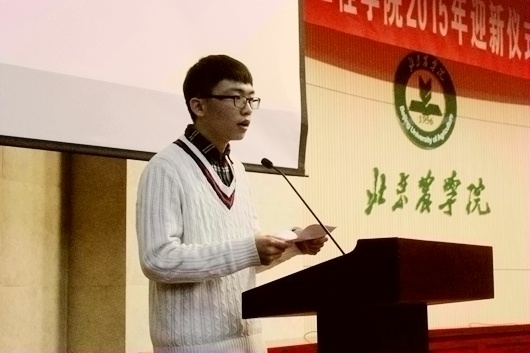 刘志杨同学代表全体2015级新生发言,与大家分享了入学后的感悟。他说,大学的学习和生活与中学有很大的不同,有很多同学感到很不适应,但是学院领导老师的关怀和学长学姐的热情帮助让同学们感受到了温暖,相信2015级全体同学面对各种挑战,一定会迎难而上,努力学习、认真工作、积极参加各项活动,收获属于自己的精彩。青晨同学代表老生发言,与同学们分享和交流她的学习、生活经验。青晨同学连续两年获得国家奖学金、特等奖学金、三好学生等荣誉称号,并在校运动会、数学建模比赛、英语竞赛等活动中荣获多个奖项。她把自己的学习经验和参赛经验毫无保留的与同学们进行分享,她说,只要你比别人更努力一些、更认真一些,一定能够收获的更多。