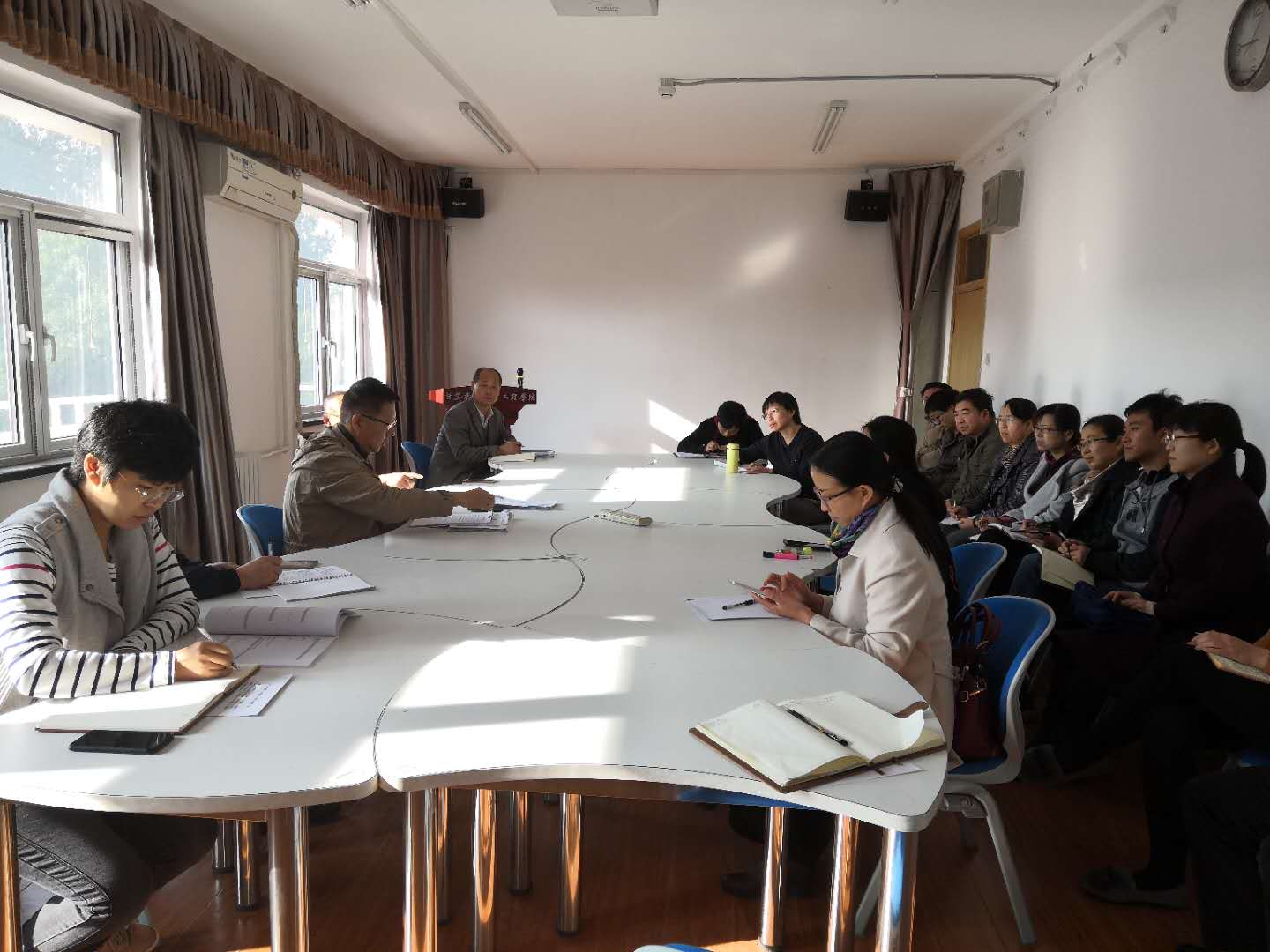 2018年10月19日上午9点和中午12点半,计算机与信息工程学院在2号楼4015会议室分两次召开本科教学审核评估工作推进会。学院全体教师参加会议,党总支书记韩宝平主持会议。会上,院长徐践通报了校内督导组专家对学院本科教学审核评估工作检查反馈意见,强调各工作小组要根据督导组意见,提高思想认识,进一步细化支撑材料、规范各类档案建设。计算机科学与技术系系主任兰彬、信息管理与信息技术系刘莹莹分别就目前课程档案、毕业论文、专业实习和毕业实习等工作主要存在的问题作了具体说明。党总支书记韩宝平指出,学院将根据校内专家的中肯意见,及时整改档案建设目前存在的问题,进一步推动本科教学工作质量的提高。