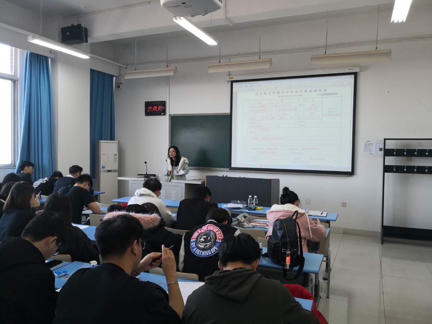 会上,郭贵川老师结合国家和北京市的最新就业政策 分析了目前的就业形势,再通过往年毕业生就业去向及计算机类专业的特点分析了同学们重点的就业方向。之后,郭老师对《北京地区高校毕业生就业试用手册2018》进行了解读,详细为大家讲解了与就业相关的流程和重要表格,并从用人单位、学校和社会等几方面为同学们介绍了很多实用的就业技巧。
