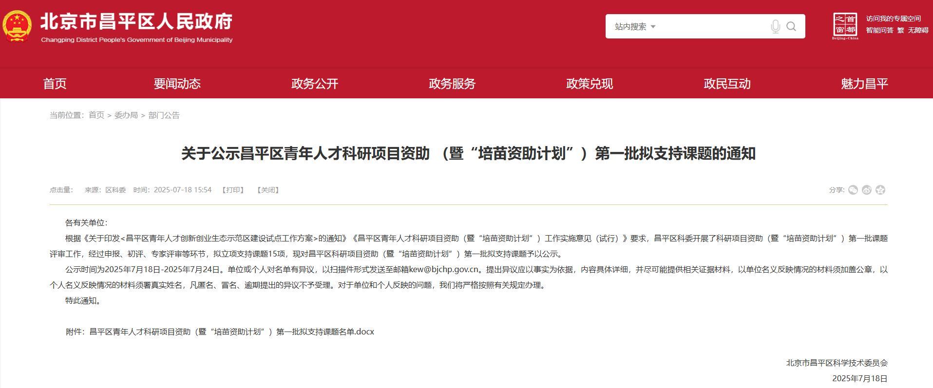 据悉,昌平区首次实施青年人才科研项目(暨“培苗资助计划”),旨在围绕医药健康、先进制造、先进能源等主导产业方向,以及人工智能、合成生物制造、6G、智能机器人、新材料等未来产业方向,遴选不超过1535岁以下从事基础研究、开展探索性、前瞻性和颠覆性项目攻关的青年人才,并给予长期稳定项目经费支持。参与此次项目申报的单位包括来自清华大学、北京大学、北京航空航天大学、北京师范大学等众多顶尖大学和研究院所团队,项目竞争异常激烈。评审过程分为初评、专家函评和项目负责人现场答辩等环节,其中通过专家函评进入现场答辩的项目58个,最终有15个项目获批资助。