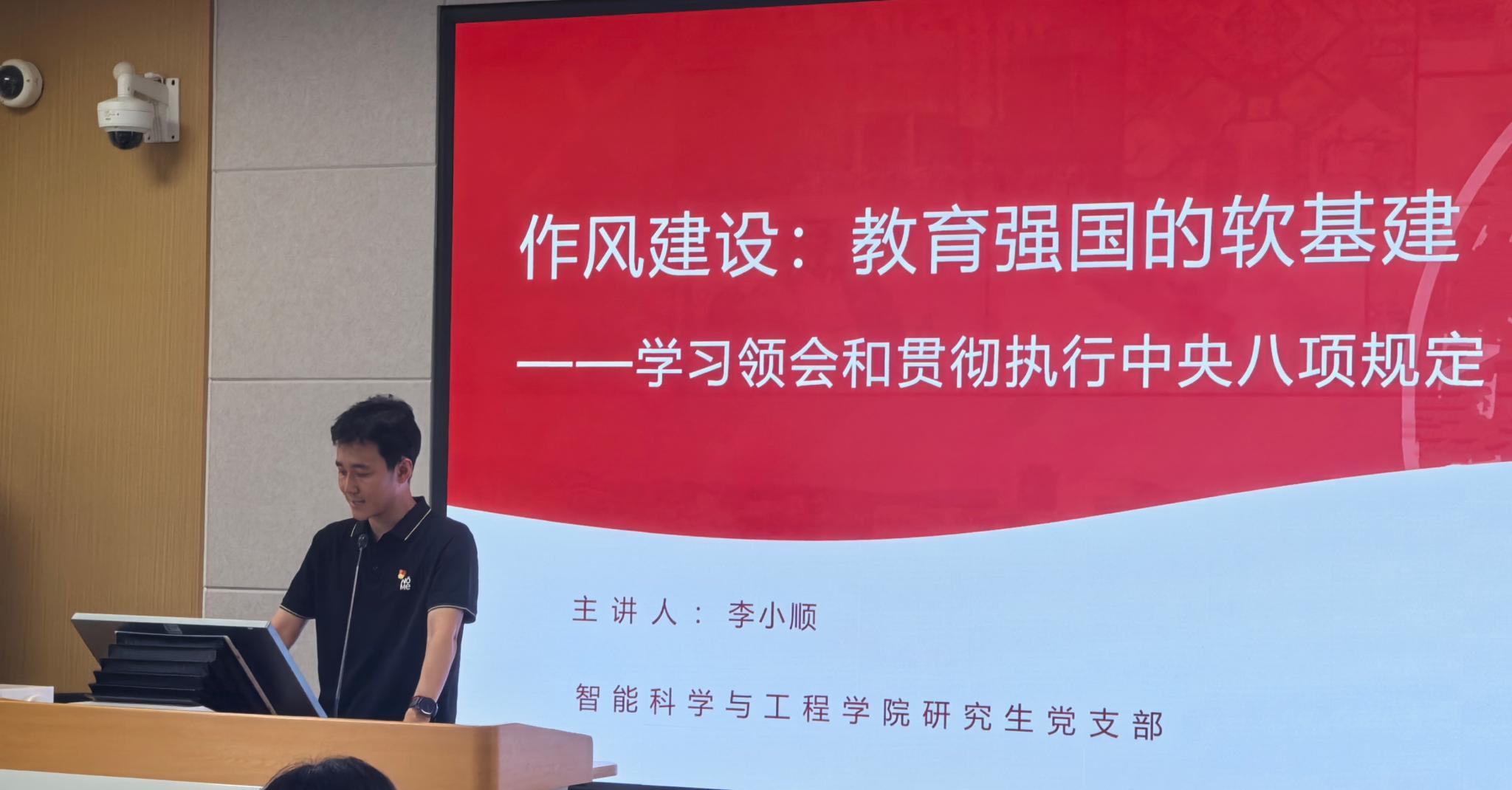智能学院研究生党支部书记李小顺以作风建设、教育强国的软基建为切入点,探讨了在教育领域和科研领域中党员需坚守的行为准则。他着重强调了研究生党员在学术研究中必须严格保证学术诚信,坚决杜绝滥用AI技术等可能导致学术作假、资源浪费的行为。任何弄虚作假的行为都将对个人、对集体乃至整个学术生态造成严重的负面影响,研究生党员应当以身作则,带头遵守学术规范。