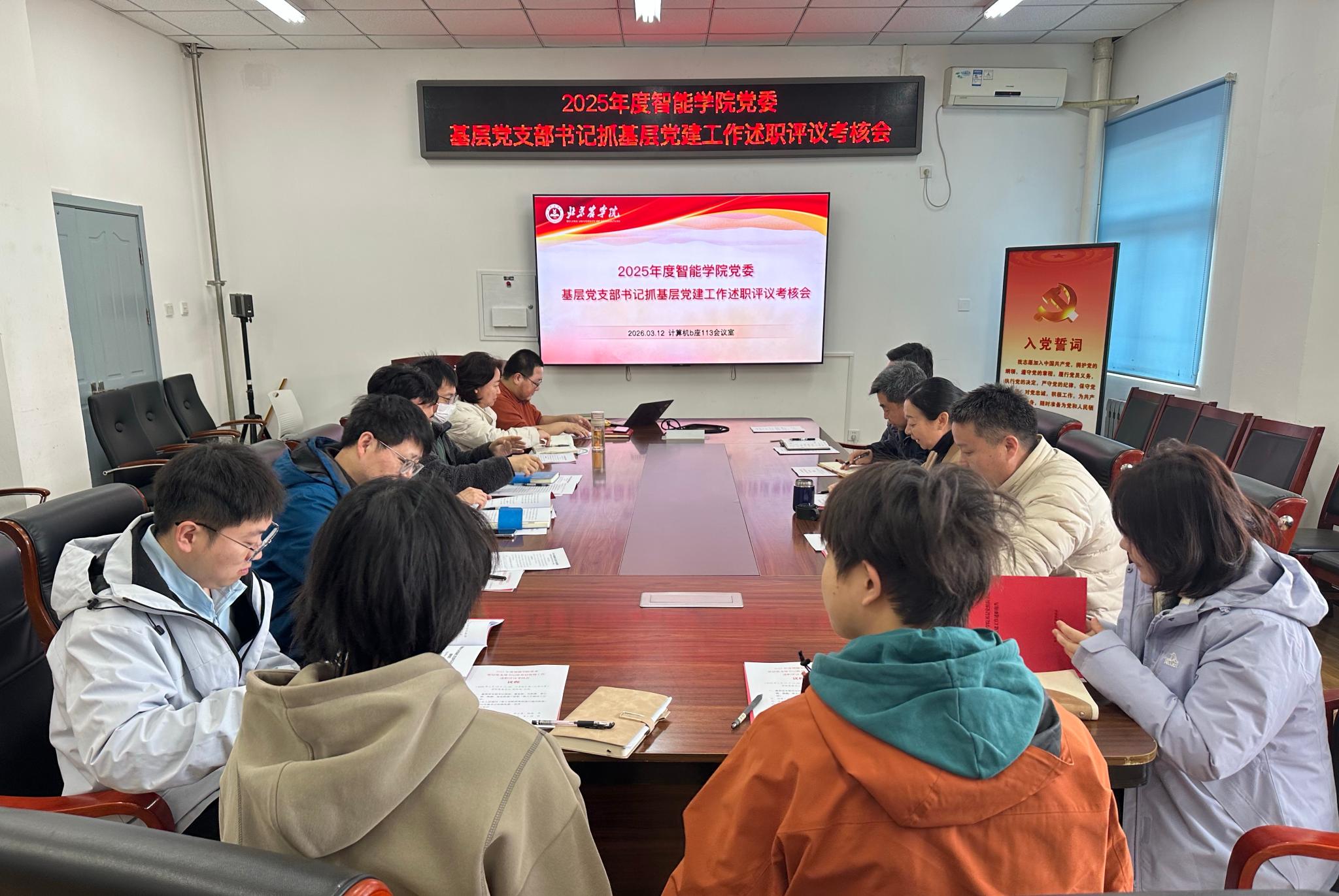 2026年3月12日下午2:00,智能学院党委在计算机B座113会议室召开2025年度基层党支部书记抓基层党建工作述职评议考核会。学院党委书记张晓凤主持会议,学院党委委员、各党支部书记及师生代表参加会议,动科学院组织员董晨阳列席会议。